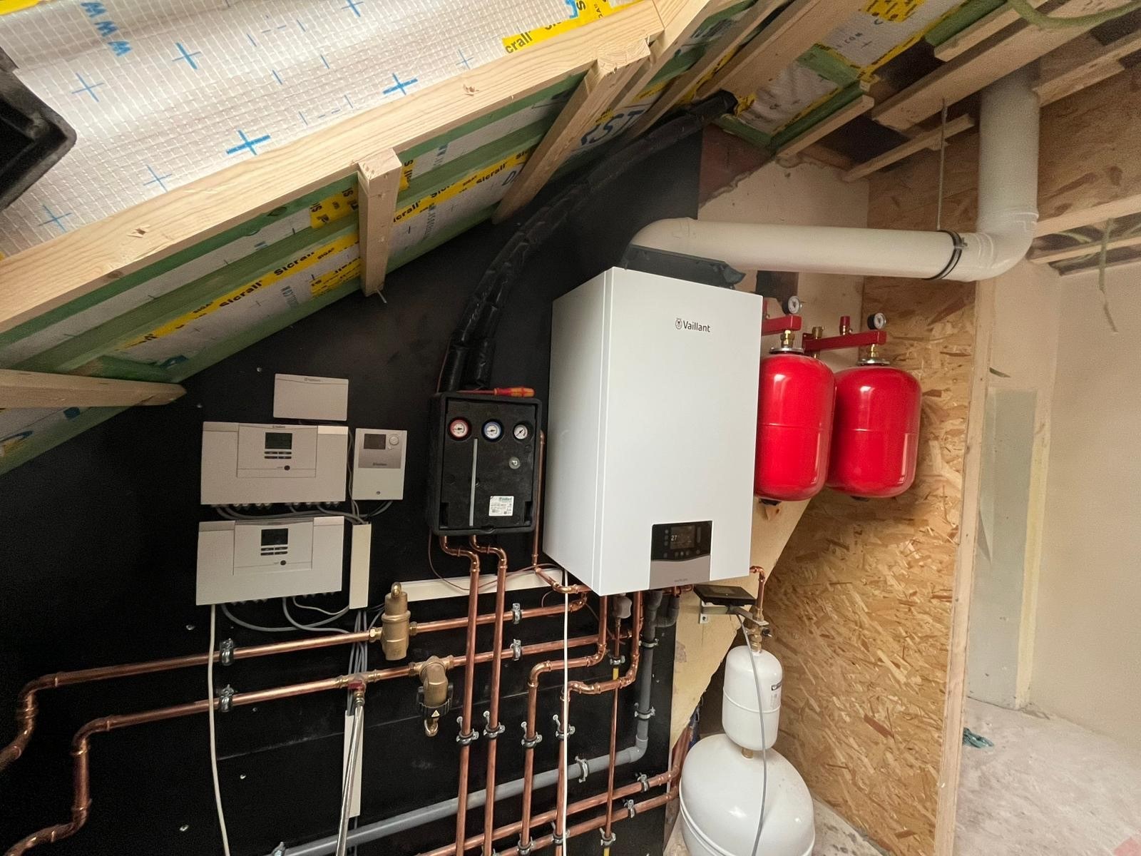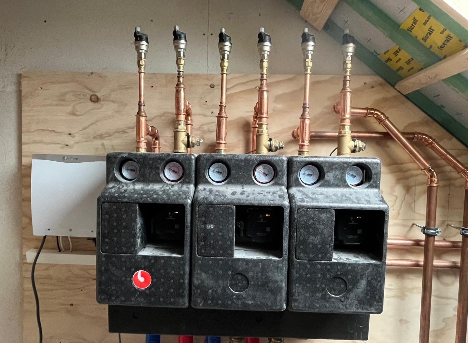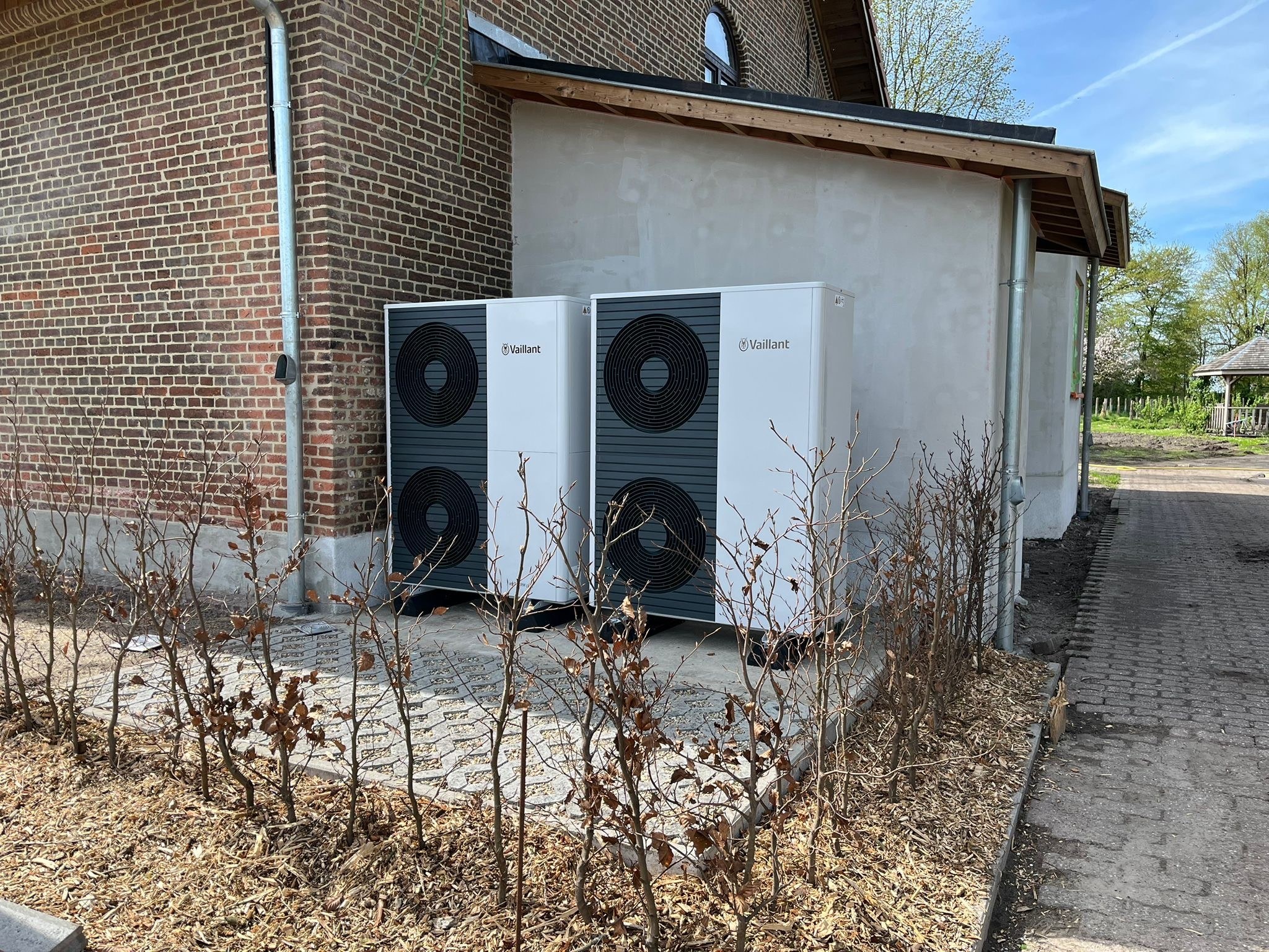 Voor deze installatie kozen we een hybride warmtepompopstelling in cascade van Vaillant, waarbij meerdere toestellen naadloos samenwerken voor maximale efficiëntie en bedrijfszekerheid. De slimme combinatie van warmtepomptechnologie met een bijkomende verwarmingsbron zorgt voor optimale prestaties in elk seizoen, zelfs bij hogere warmtevraag.